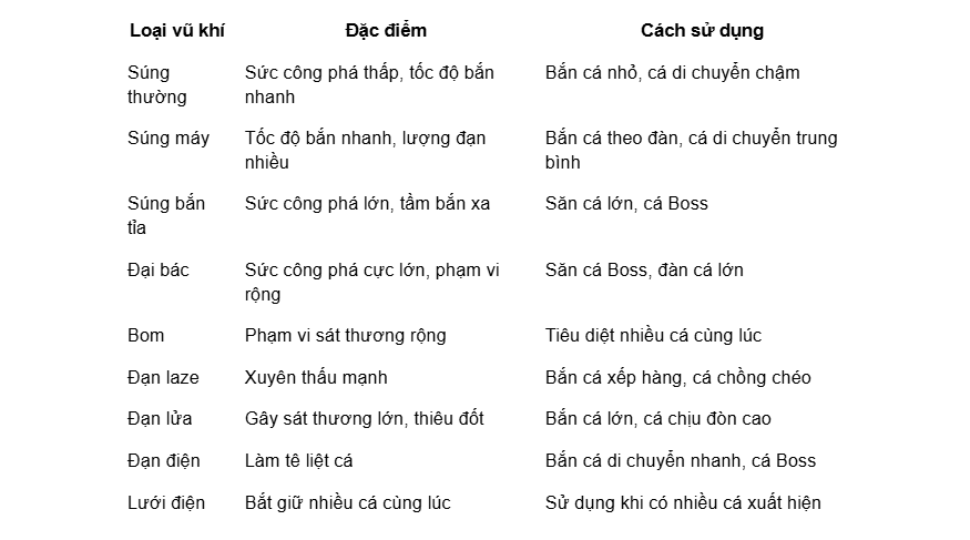Hầu hết các game bắn cá đều có những loại vũ khí cơ bản sau: