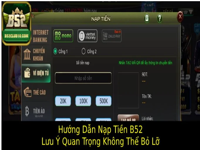 Sự phát triển của ví điện tử đã mang đến sự tiện lợi đáng kể trong các giao dịch trực tuyến, và B52 cũng không nằm ngoài xu hướng này. Việc nạp tiền qua ví điện tử hết sức thông dụng như Momo, ZaloPay hay ViettelPay giúp bạn tiết kiệm rất nhiều thời gian và công sức khi đem so sánh với những phương pháp truyền thống. Bạn chỉ cần liên kết ví điện tử của mình với tài khoản B52, sau đó thực hiện nạp tiền một cách nhanh chóng, dễ dàng.