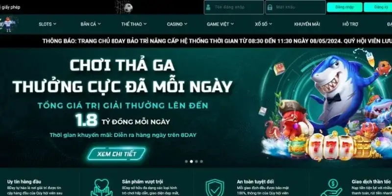 Sự kết hợp giữa tiềm lực tài chính mạnh mẽ, kho game đa dạng, công nghệ bảo mật hiện đại và dịch vụ khách hàng tận tâm đã khiến 8DAY trở thành một trong những nhà cái được yêu thích nhất tại Việt Nam. Nếu bạn đang tìm kiếm một sân chơi cá cược trực tuyến đáng tin cậy và hấp dẫn, đừng bỏ qua 8DAY để trải nghiệm những ưu đãi và trò chơi đỉnh cao mà nhà cái này mang lại.